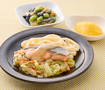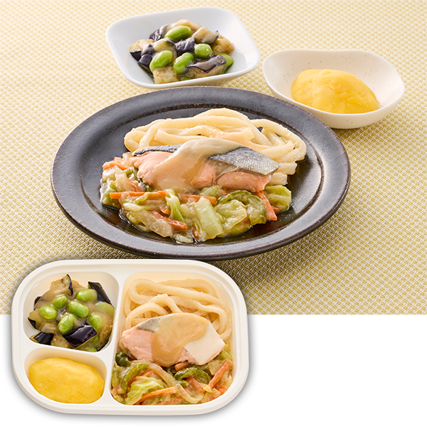 *サーモンの味噌バターソース、なすと枝豆の生姜和え、レモンきんとん、野菜のソテー、うどん