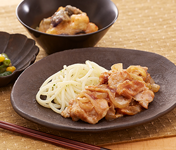 *豚肉のしょうが焼き、なすと厚揚げのピリ辛おろしあん、いんげんとコーンのソテー、パセリの塩パスタ