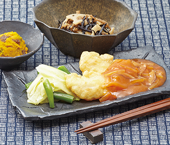 *白身魚の甘酢あんかけ、れんこんとひじきの煮物、レーズン入りマッシュかぼちゃ、キャベツの塩だし和え